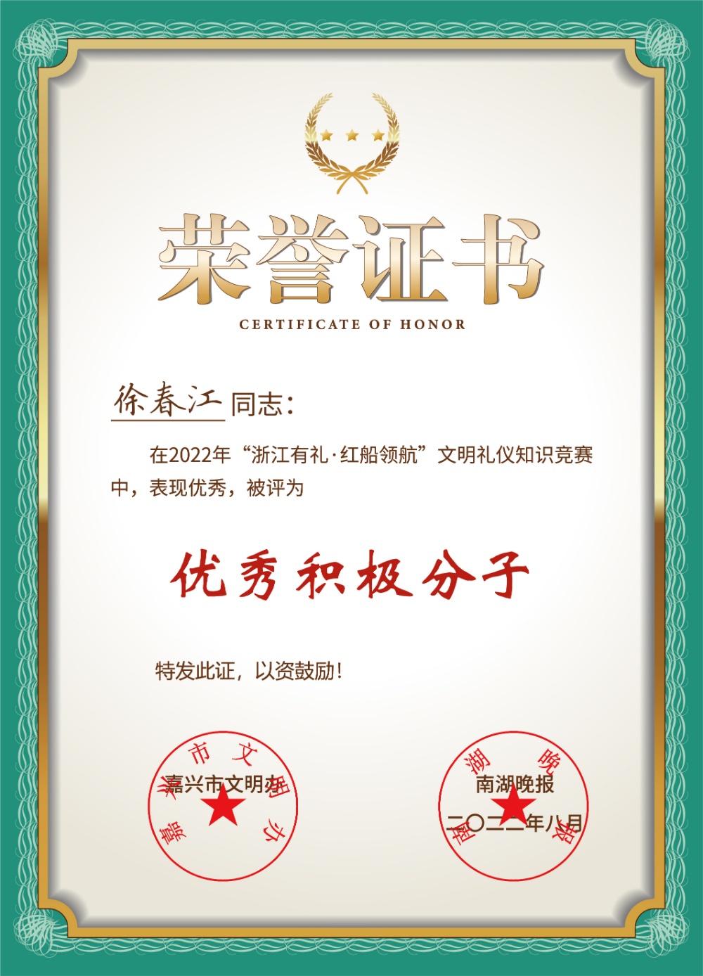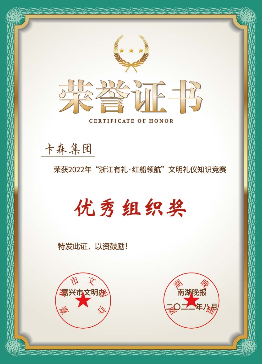日前,“浙江有禮·紅船領(lǐng)航”文明禮儀知識競賽落下帷幕,海寧市獲得了總戰(zhàn)報(bào)參與率第一的好成績!我們卡森集團(tuán)榮獲優(yōu)秀組織獎(jiǎng),中共黨員徐春江、陳雪江榮獲優(yōu)秀積極分子。