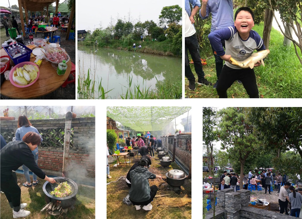 這次活動的地點是尖山金家農莊,那里景色秀麗,有蜿蜒的長廊,荷蘭風車,孩童玩的滑滑梯,共有大人小孩100多人參加了活動。喜歡釣魚的一大早趕到農莊,拿出自己的優(yōu)良漁具占領有利地勢,拋出桿,開始享受釣魚的快樂。莊主家也早已經幫助準備好了食材,年長一點的員工都有燒飯的經驗,尤新仙、沈利仙、俞建強等組員負責燒野飯,在農家的土灶上,燒起了柴火,一個個大大的鐵鍋里,放上油,炒起了咸肉、春筍、蠶豆、豌豆、香腸,菜炒熟后放上米和水,隨著時間的推移,隨之而來的香噴噴的野飯味撲鼻而來;年輕一點的負責燒烤,大家分工明確,團結協(xié)作,雖然大家是新手,但是還是有不少人參加過燒烤活動,有一點點經驗的,在其中儼然就成了師傅,爭著做起了大師傅,把烤串刷上油、香料烤了起來,燒烤網上烤串放得滿滿的,引得旁人垂涎三尺紛紛投來羨慕和貪婪的眼光。每組烤的骨肉相連、羊肉串、雞翅等一一出爐,大家相互吆喝著請其他組人員來吃自己家烤的東西,紛紛夸贊自己組烤得好吃。烤的、吃的、串門的、看的、拍照的,每個人都樂在其中……